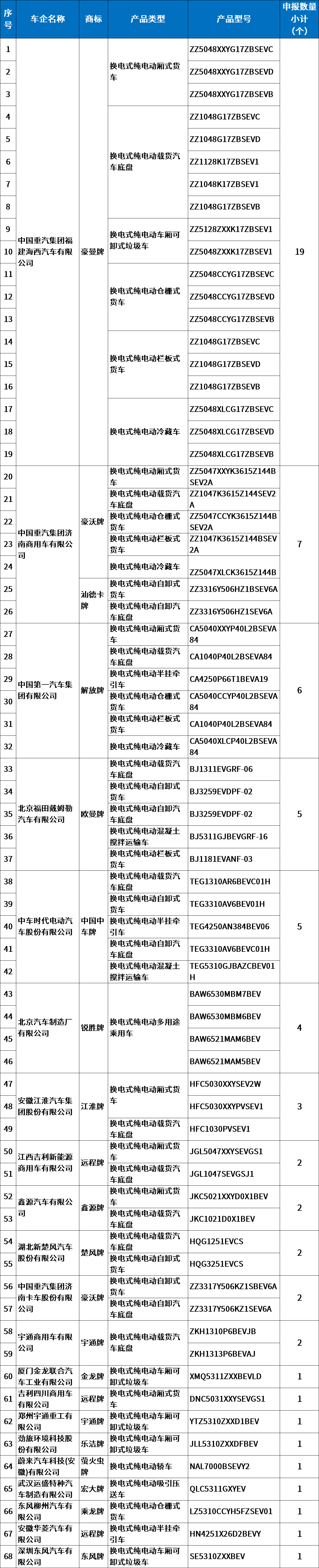 3、换电式产品:本批次公示的换电式纯电动产品共有21家企业68个型号申报(含乘用车5个,专用车44个;专用车底盘19个)。