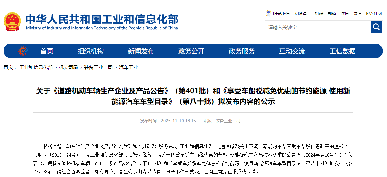 根据道路机动车辆生产企业及产品准入管理和《财政部 税务总局 工业和信息化部 交通运输部关于节能 新能源车船享受车船税优惠政策的通知》(财税〔2018〕74号)、《工业和信息化部 财政部 税务总局关于调整享受车船税优惠的节能 新能源汽车产品技术要求的公告》(2024年第10号)等有关要求,现将《道路机动车辆生产企业及产品公告》(第401批)和《享受车船税减免优惠的节约能源 使用新能源汽车车型目录》(第八十批)拟发布内容予以公示,请社会各界监督,如有异议,请在公示期内以传真、电子邮件形式或通过网上意见征求系统反馈。