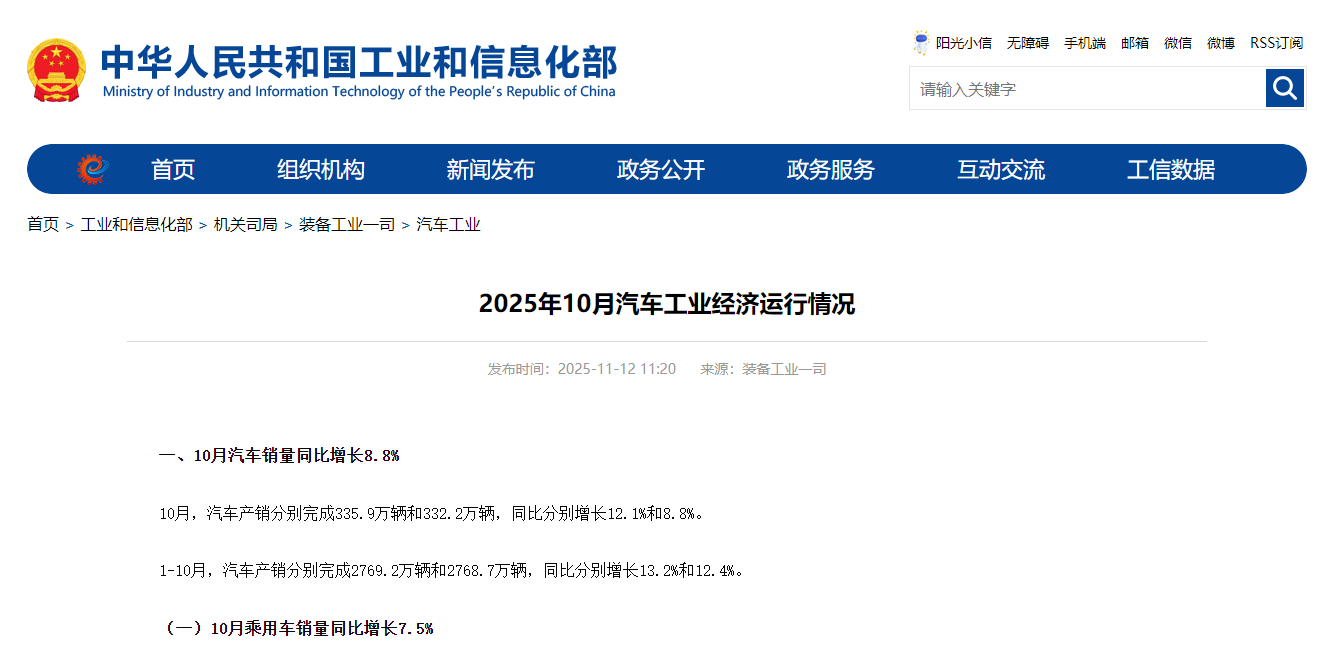 11月12日,工业和信息化部装备工业一司发布2025年10月汽车工业经济运行情况。