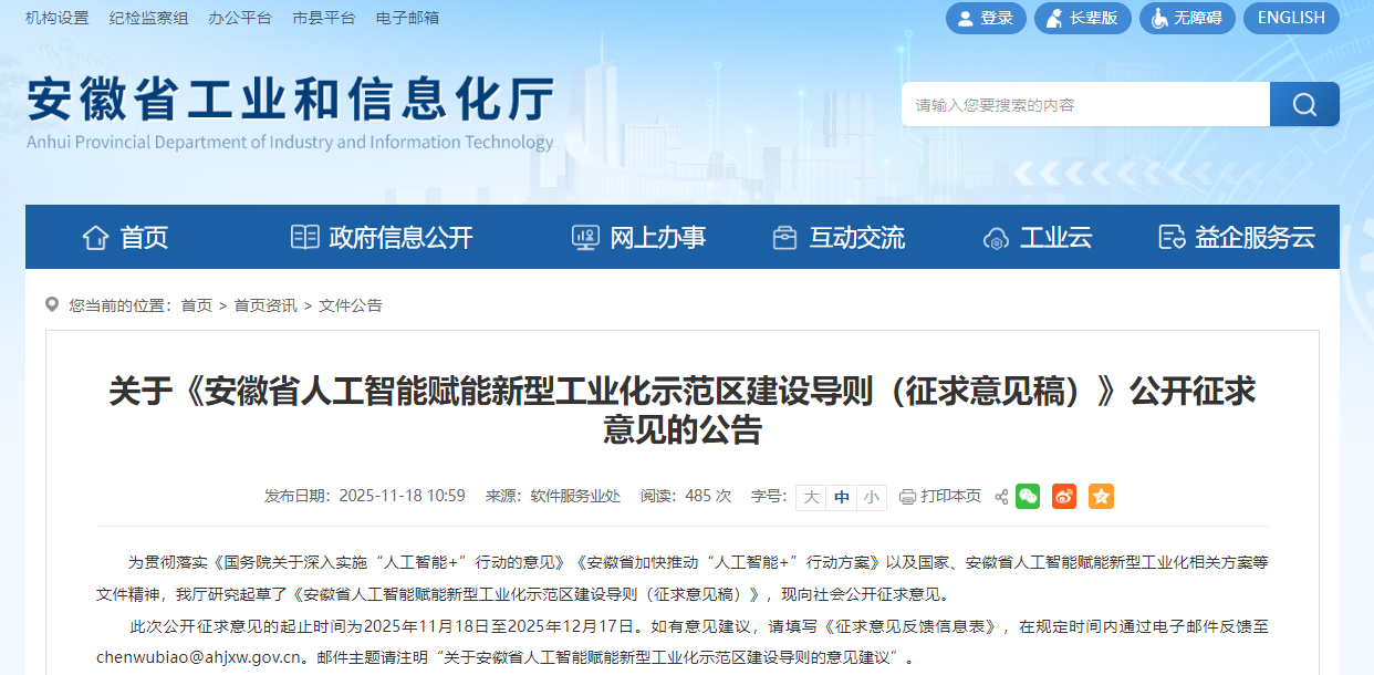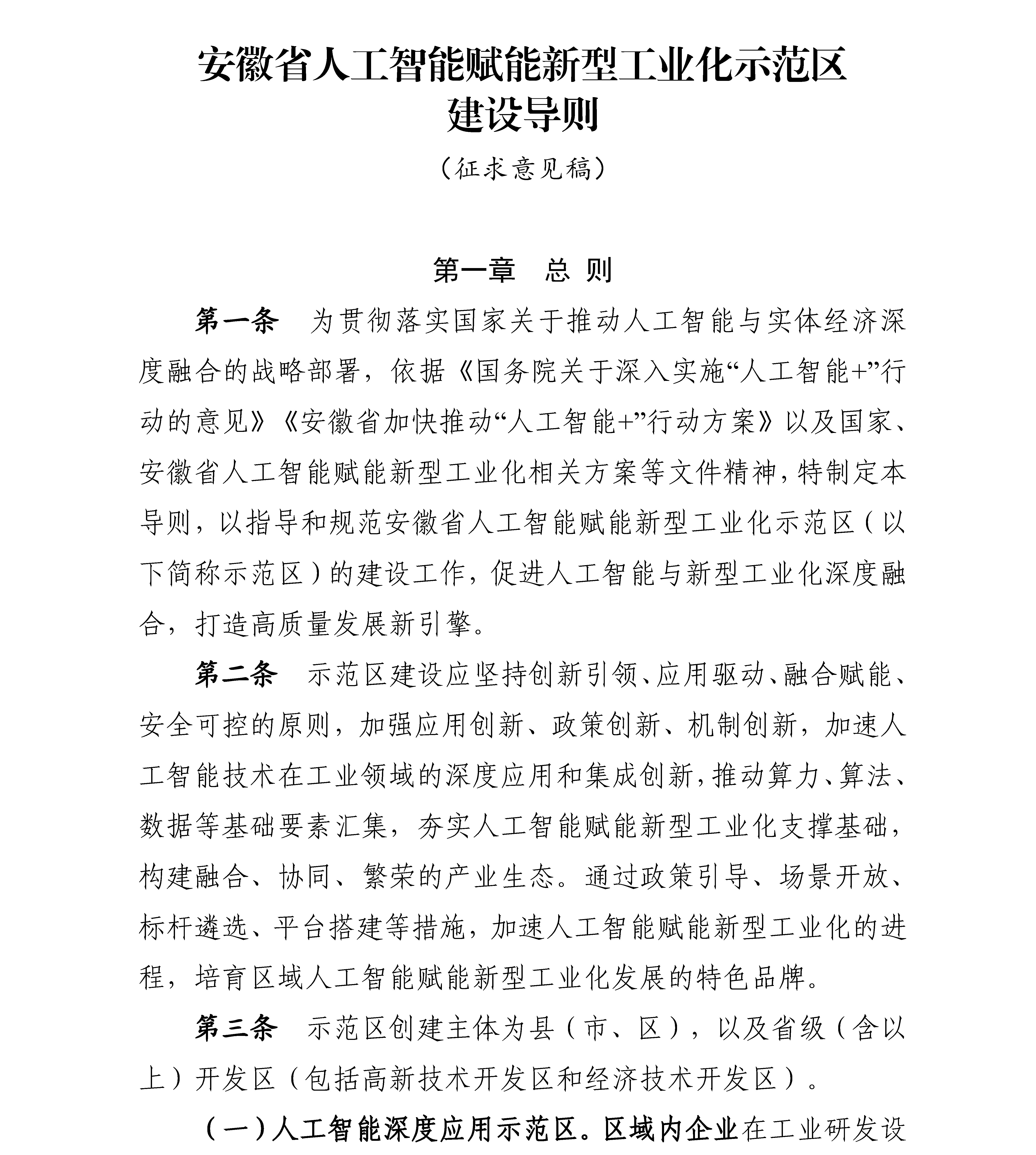 为贯彻落实《国务院关于深入实施“人工智能+”行动的意见》《安徽省加快推动“人工智能+”行动方案》以及国家、安徽省人工智能赋能新型工业化相关方案等文件精神,安徽省工业和信息化厅研究起草了《安徽省人工智能赋能新型工业化示范区建设导则(征求意见稿)》(以下简称《征求意见》),现向社会公开征求意见。