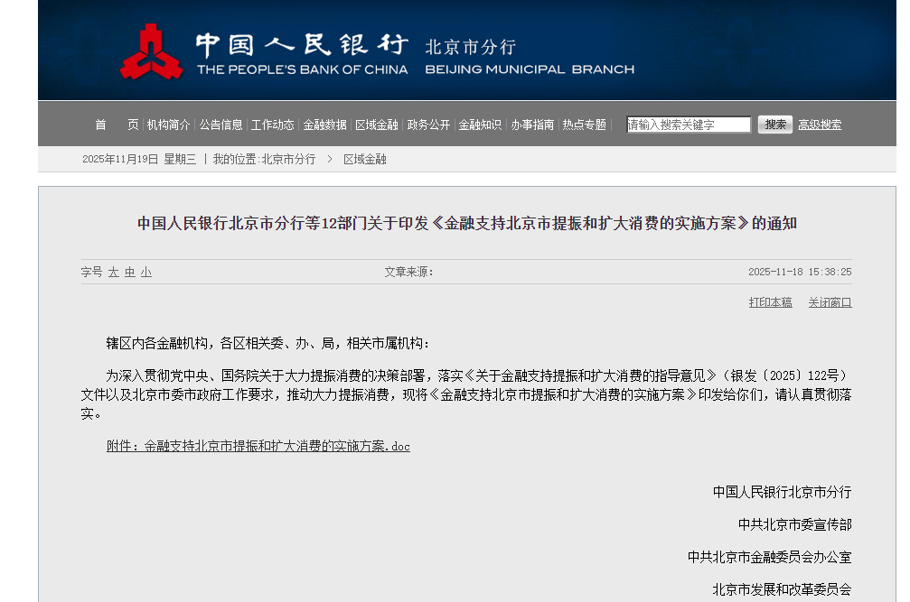 为深入贯彻党中央、国务院关于大力提振消费的决策部署,落实《关于金融支持提振和扩大消费的指导意见》文件以及北京市委市政府工作要求,围绕助力国际消费中心城市建设,强化北京市商品消费和服务消费金融供给,更好满足北京市消费领域金融服务需求,推动大力提振消费,中国人民银行北京市分行、北京市财政局等12部门联合制定《金融支持北京市提振和扩大消费的实施方案》(以下简称《方案》)并于近日发布,《实施方案》明确:
