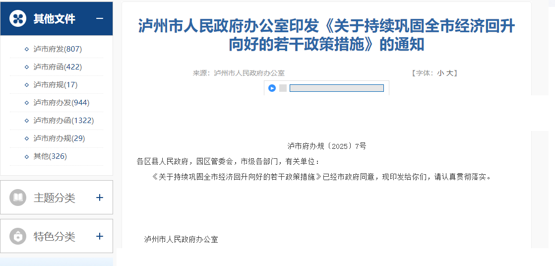 11月20日,为深入贯彻党中央、国务院关于做好经济工作的决策部署,落实省委、省政府工作要求,结合相关文件精神,巩固拓展全市经济回升向好势头,泸州市人民政府办公室制定《关于持续巩固全市经济回升向好的若干政策措施》(以下简称《措施》)并于近日发布,《措施》明确: