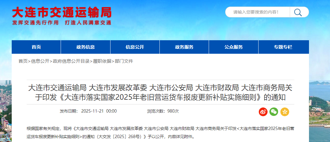 为认真做好大连市2025年老旧营运货车报废更新补贴实施工作,大连市交通运输局 大连市发展改革委、大连市公安局 大连市财政局 大连市商务局制定出台了《大连市落实国家2025年老旧营运货车报废更新补贴实施细则》,现予以公告。