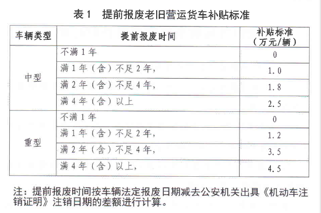 老旧营运货车报废更新按照报废车辆类型、提前报废时间和新购置车辆动力类型等,实施差别化资金标准。