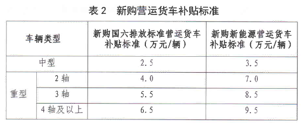 其中,新购国六排放标准营运货车或新能源营运货车补贴标准如下。报废老旧营运货车提前报废时间不足一年的,可以申