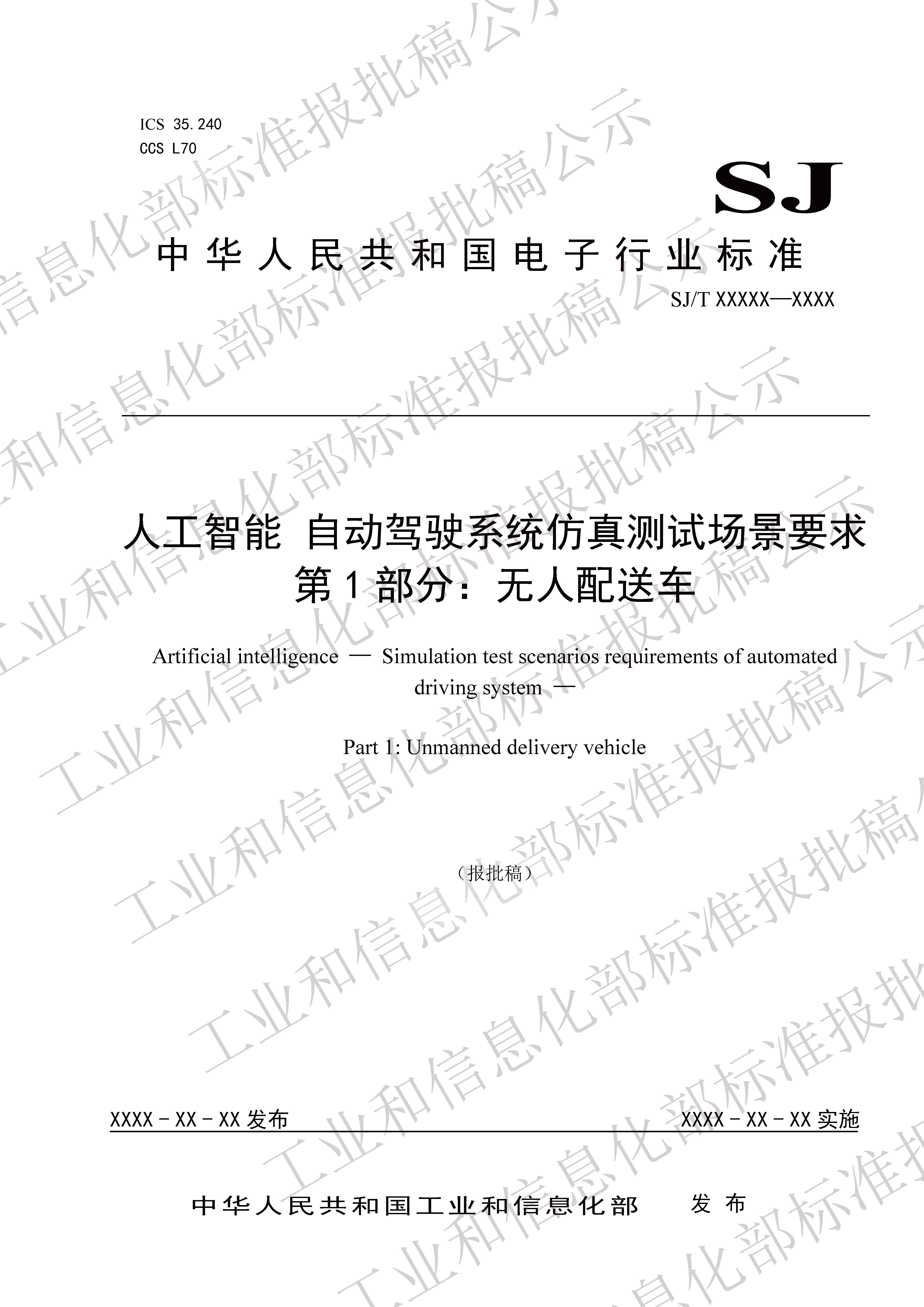 标准名称:人工智能 自动驾驶系统仿真测试场景要求 第1部分:无人配送车