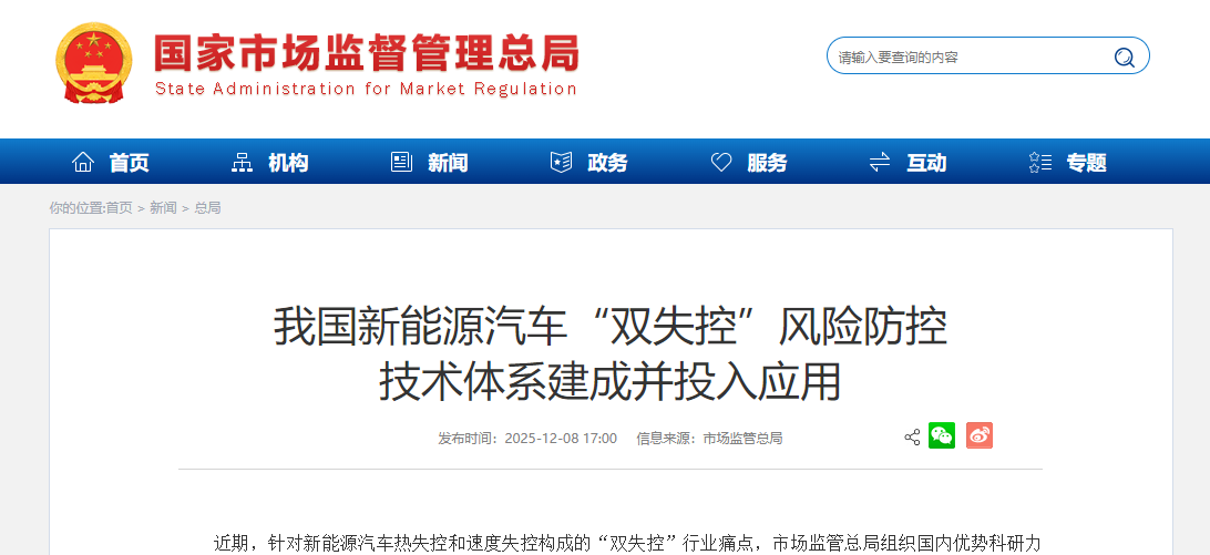 从市场监管总局获悉,近期,针对新能源汽车热失控和速度失控构成的“双失控”行业痛点,市场监管总局组织国内优势科研力量,通过“双失控”事故深度调查与缺陷判定技术研发,结合“线上预警+线下检测”一体化风险防控机制,加之“新能源汽车智慧监管云平台”的统筹赋能,构建起新能源汽车“双失控”风险防控技术体系并投入应用,为提升召回监管科学化水平、保障消费者人身和财产安全提供了技术支撑。