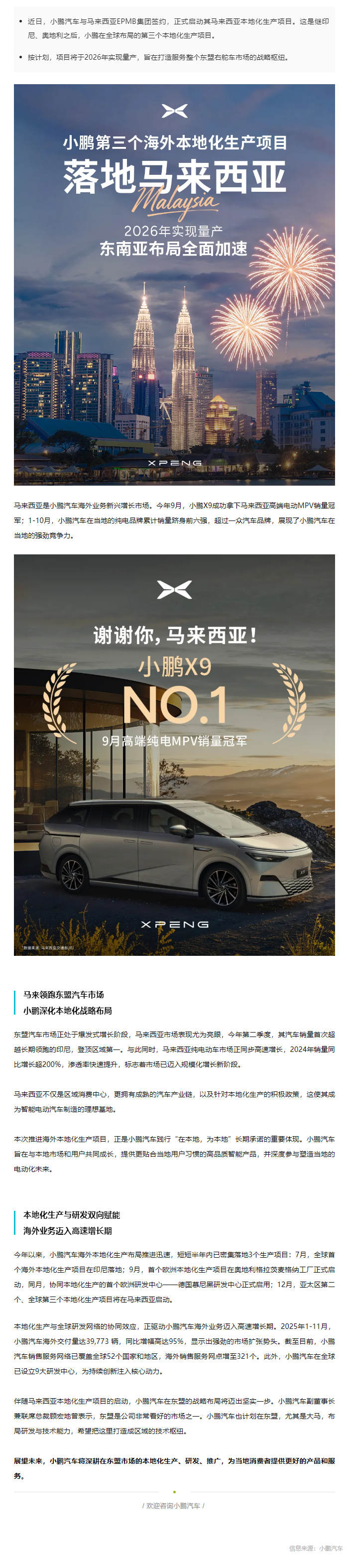 小鹏汽车第三个海外本地化生产项目将落地马来西亚