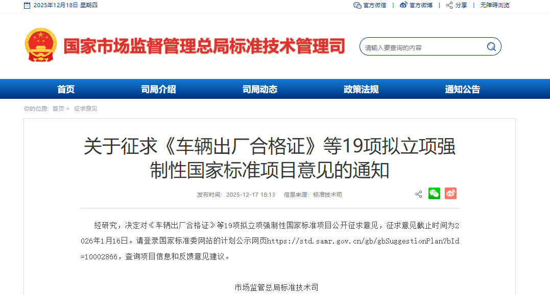 国家市场监督管理总局标准技术管理司对《智能网联汽车道路通行规定符合性测试内容和方法》拟立项强制性国家标准项目公开征求意见。