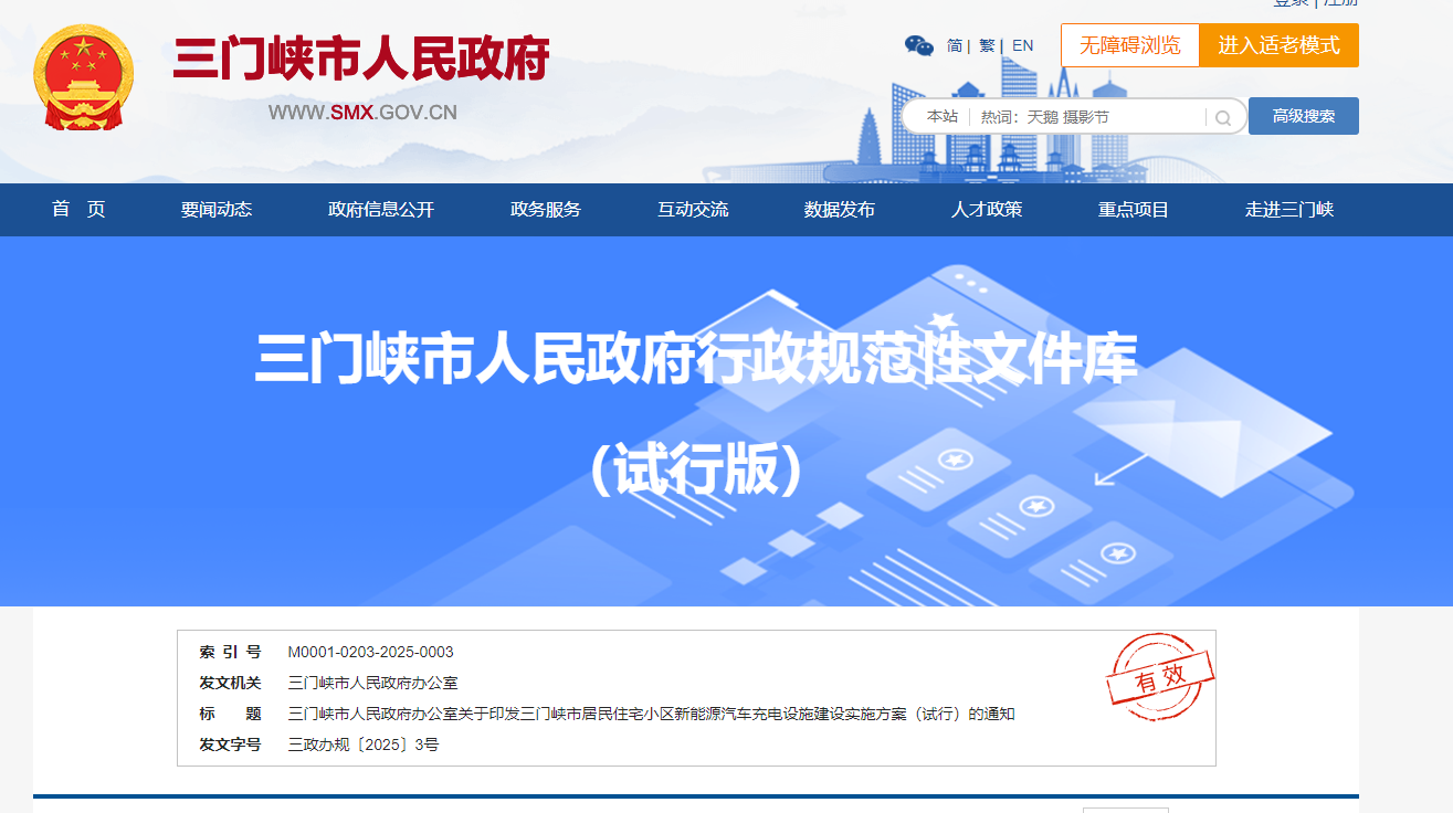 为加快推进三门峡市新能源汽车充电设施建设,规范新能源汽车充电设施管理,增加公共产品供给、方便人民群众生活、促进智慧城市发展,根据相关文件等有关要求,结合本市实际,三门峡市人民政府办公室制定《三门峡市居民住宅小区新能源汽车充电设施建设实施方案(试行)》(以下简称《方案》)并于近日发布,《方案》明确: